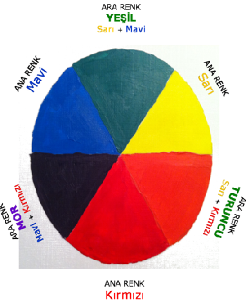 3 ana rengi (MAVİ, SARI, KIRMIZI) karıştırıp ara renkleri elde ettikten sonra, ara renkleri (yeşil, turuncu, mor) karıştırıp üçüncül renkleri de elde elde edebilirsiniz.
