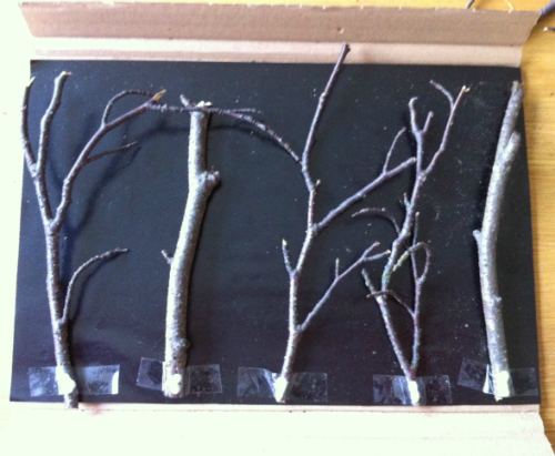 Malzemeler : Küçük dal parçaları, dikdörtgen şeklinde kalın karton (koli kartonu olabilir), A4 boyutunda siyah el işi kağıdı (ya da keçe), oynayan gözler, selobant, yapıştırıcı