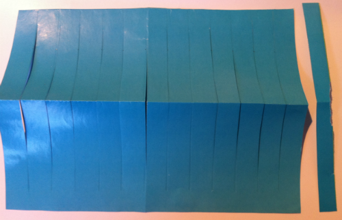 İlk iş, elişi kağıdını uzun tarafından ortadan ikiye katlayalım. Sonra fenere sap yapmak için kağıdın kısa tarafından 1 cm. kadar genişlikte bir şerit kesmelisiniz. Ardından cetvel ile keseceğimiz çizgileri çizmemiz gerekiyor. Çizgileri eşit aralıklarla çizmelisiniz. Ama resimdeki gibi, yapıştırmak için elişi kağıdının iki ucunun birer bölümünü kesmeyeceğiz.