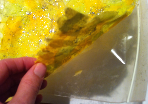 Beyaz tutkalı su ile sulandırın. Boza kıvamından sulu olmalı ama çok da sulu olmamalı. Ardından renkler karışık olacak ve her bir parçanın bir ucu diğerinin üzerine çıkacak şekilde peçete parçalarını gıda poşetinin üzerine dizin. Dizme işleminde çok fazla ilerlemeden parçaların birbirine yapışması için bir fırça yardımı ile sulandırılmış tutkalı peçete parçalarının üzerine sürerek ilerlerseniz işiniz kolaylaşacaktır. Poşetin tamamı peçete parçaları ile kaplandığında kurumaya bırakın. Kuruduktan sonra aynı işlemi 2 kere daha yapın ve en üste sim dökün; kuruduktan sonra simlerin dökülmemesi için sulandırılmış tutkaldan sürebilirsiniz. Dilerseniz farklı renklerde farklı peçete tabakaları oluşturabilirsiniz.