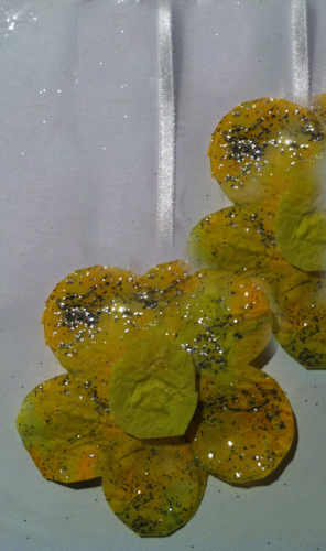 Biz çiçek yaptık. Tek bir çiçek yapmak yerine birden fazla yapabilirsiniz; hatta farklı renk ve boyutlarda çiçekler hazırlayabilirsiniz. Daha sonra dilerseniz çiçeği kurdeleye yapıştırıp asın; dilerseniz süz olarak bir defterin üstüne yapıştırın. Uzun bir kurdeleye bir çok çiçek yapıştırıp bir yere de asabilirsiniz.